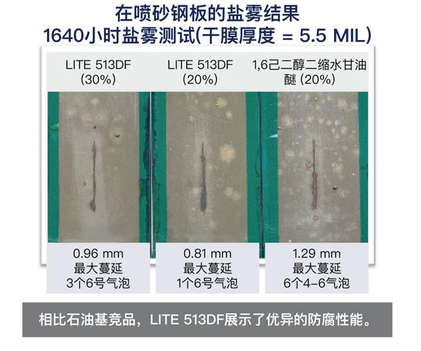LITE 513DF是一款基于腰果殼油的新型高生物含量稀釋劑,它的環(huán)氧當(dāng)量比標(biāo)準(zhǔn)的513型號(hào)要低。這款產(chǎn)品適用于環(huán)氧涂料、單組分和雙組分粘合劑以及復(fù)合材料。LITE 513DF粘度低,具有優(yōu)異的稀釋能力,與雙酚A型液體環(huán)氧樹脂的添加重量曲線如圖所示。作為稀釋劑,它在環(huán)境溫度和低溫下具有良好的硬度發(fā)展。與其他腰果殼油改性的材料類似,LITE 513DF具有良好的耐水性和柔韌性。在涂料應(yīng)用中,LITE 513DF在長期鹽霧試驗(yàn)中表現(xiàn)出非常好的防腐性能,請見本頁面板的圖片。在粘合劑應(yīng)用中,這種環(huán)氧稀釋劑還可作為改性劑,提高伸長率和粘結(jié)強(qiáng)度,同時(shí)將對Tg和抗拉強(qiáng)度的影響降至低。