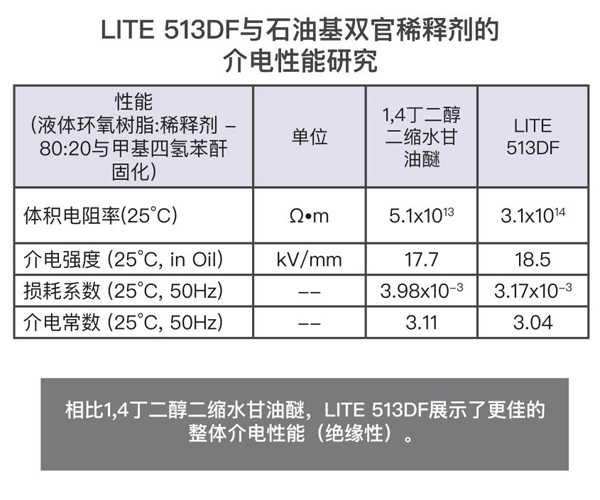 根據(jù)IEC 62631和IEC 60243標(biāo)準(zhǔn)進(jìn)行測試,如其介電性能所示,LITE 513DF提供了良好的絕緣性能。在Epon 828的配方中,樹脂的使用量為20%,用MTHPA(甲基四氫鄰苯二甲酸酐)固化,并用BDMA(芐基二甲胺)催化。LITE 513DF展示了優(yōu)異的結(jié)果,其體積電阻率和介電強(qiáng)度更高,損耗因數(shù)和介電常數(shù)比競品1,4丁二醇二縮水甘油醚更低。當(dāng)兩種稀釋環(huán)氧樹脂體系都暴露于高溫或鹽溶液中時(shí),LITE 513DF的性能優(yōu)于石油基雙官能稀釋劑。LITE 513DF是一款良好的環(huán)氧稀釋劑和改性劑,適用于電氣灌封、鑄造和封裝(浸漬樹脂)。